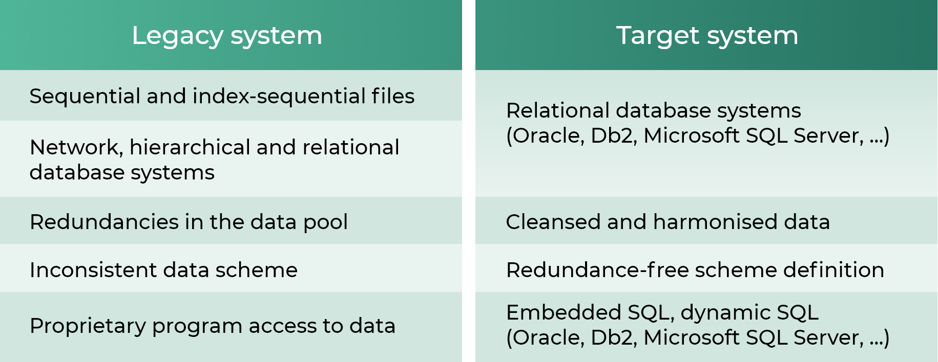 A professional database system at the target system must be built within the framework of a legacy migration. With the FiRe technology from pro et con, databases and files with different structures can be migrated to modern databases.