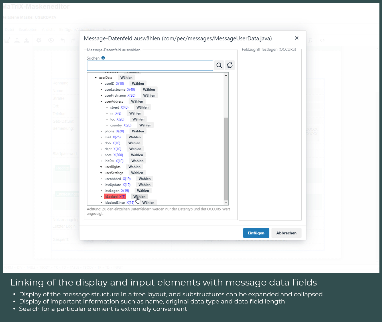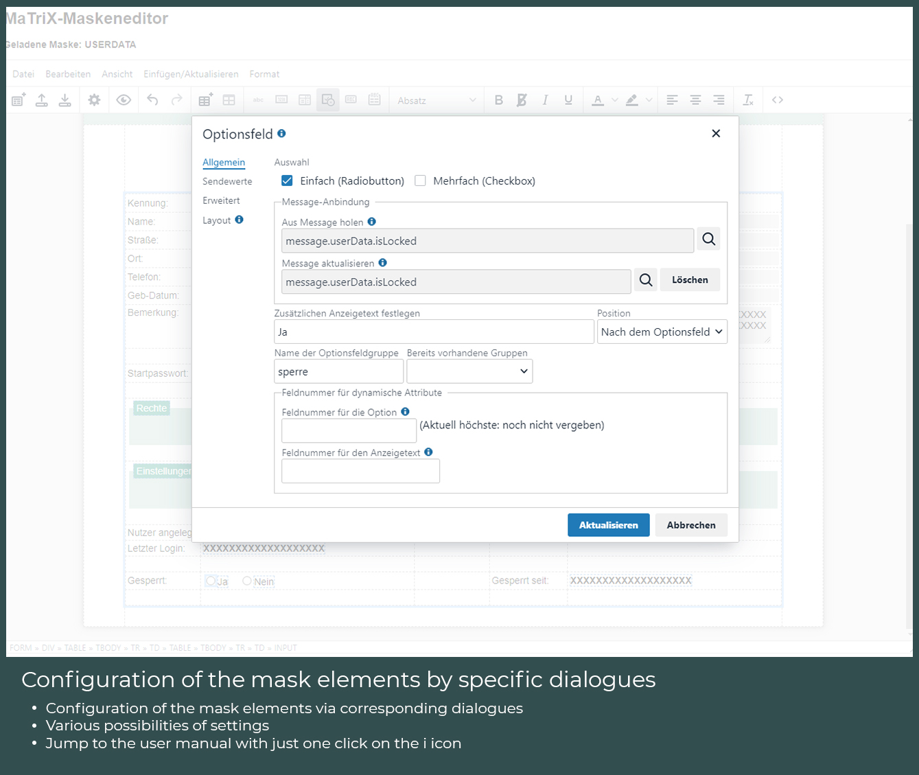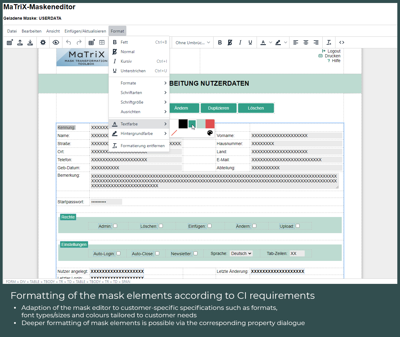 For editing the modernised screen masks, the MaTriX mask editor is used. This works on the WYSIWYG principle which means that there is no need to learn a mask description language. Analogous to known graphical HTML editors, the user is allowed to create and process the masks via mouse interaction, menus and toolbars. In doing so, a wide range of design elements is supported: