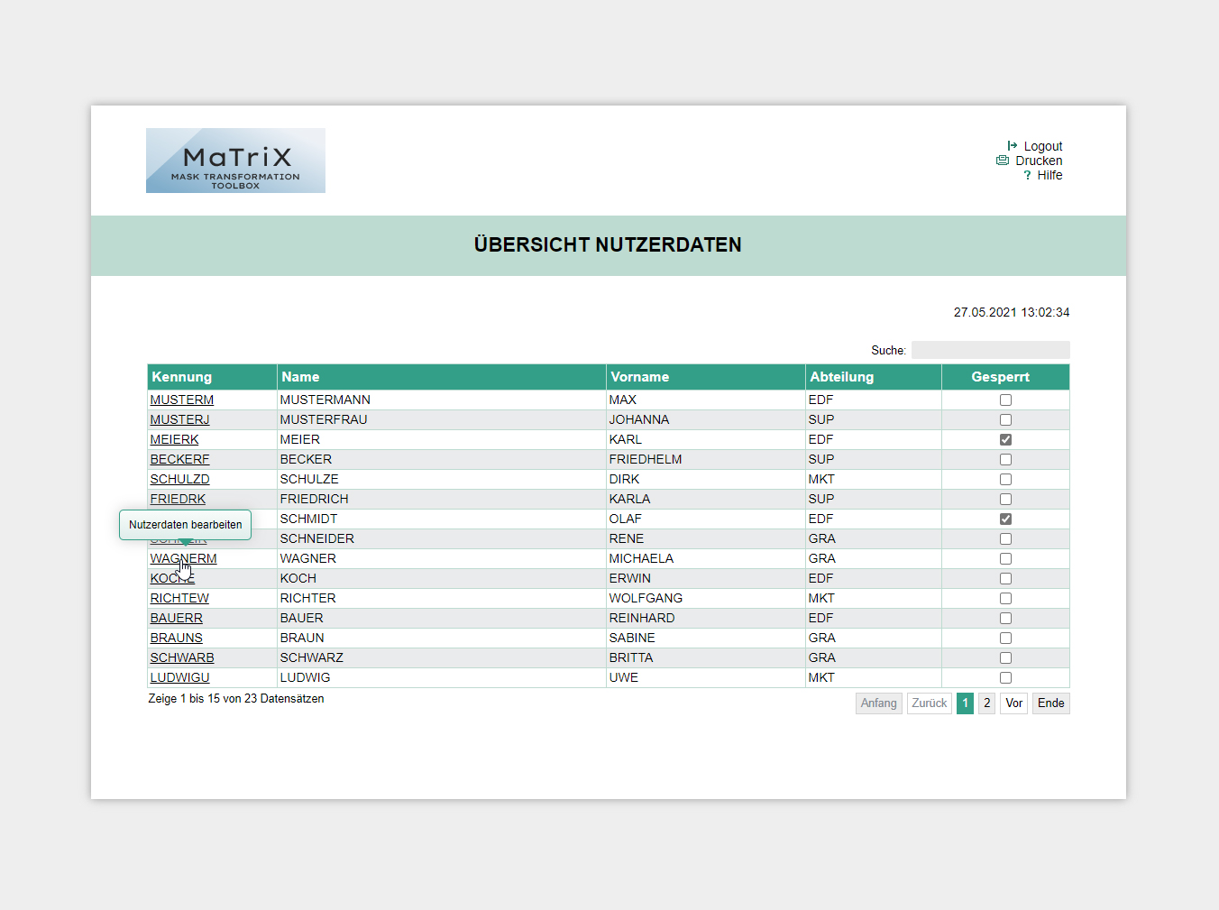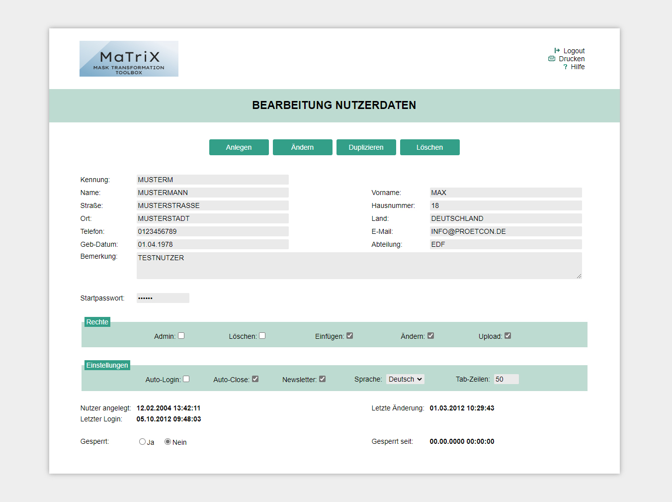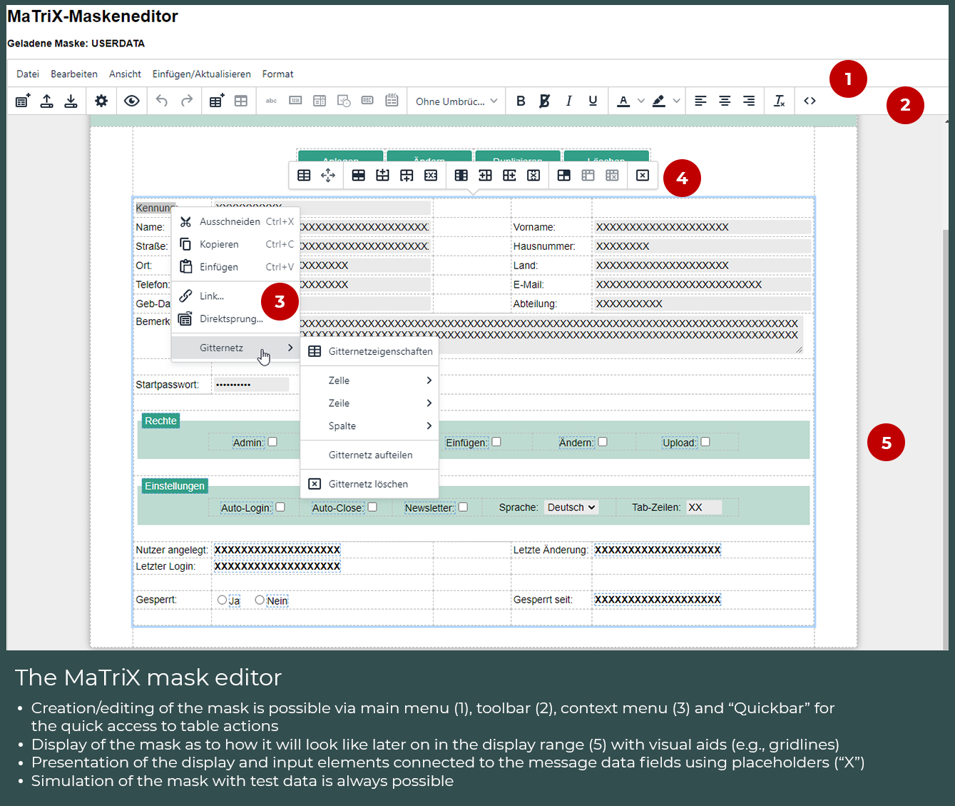 For editing the modernised screen masks, the MaTriX mask editor is used. This works on the WYSIWYG principle which means that there is no need to learn a mask description language. Analogous to known graphical HTML editors, the user is allowed to create and process the masks via mouse interaction, menus and toolbars. In doing so, a wide range of design elements is supported: