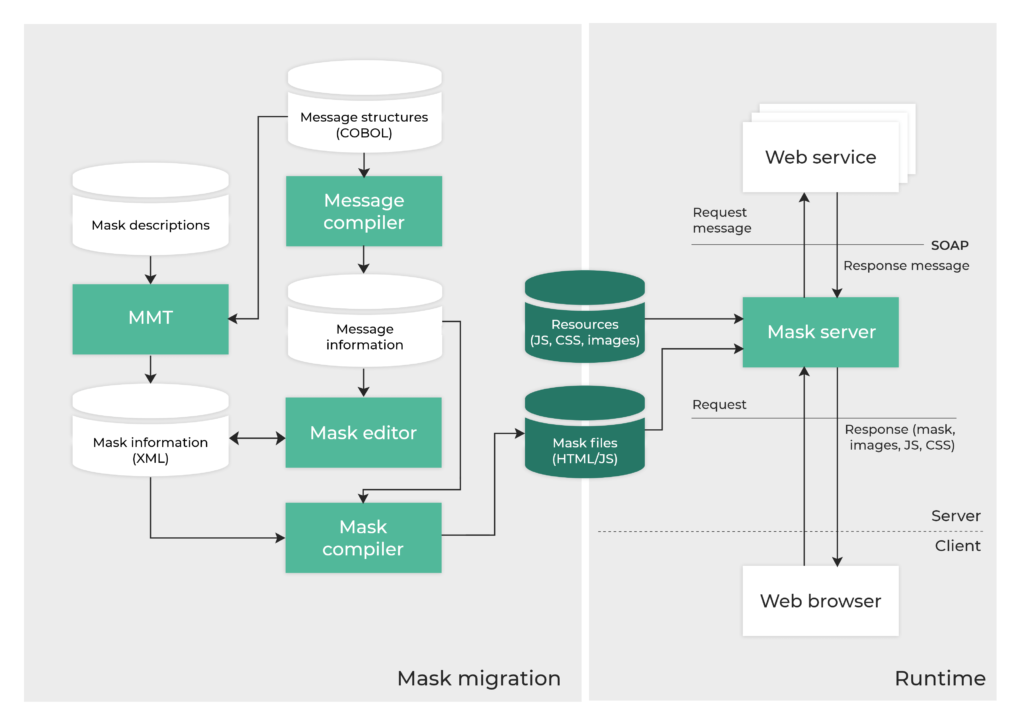 The mask migration tool (MMT) converts the mask descriptions and message structures (COBOL) and saves these mask information for further processing in XML format.