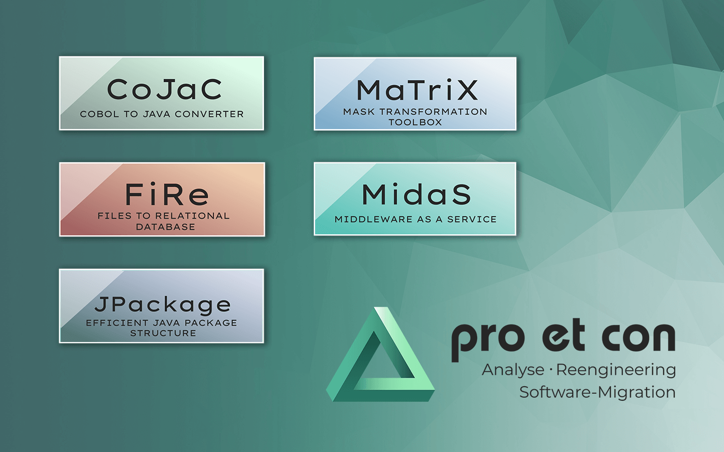 Teil der Überarbeitung war auch die Aktualisierung unserer Logos, welche das Firmenlogo sowie unsere Tool-Logos (CoJaC, MaTriX, FiRe, MidaS und JPackage) einschließen.