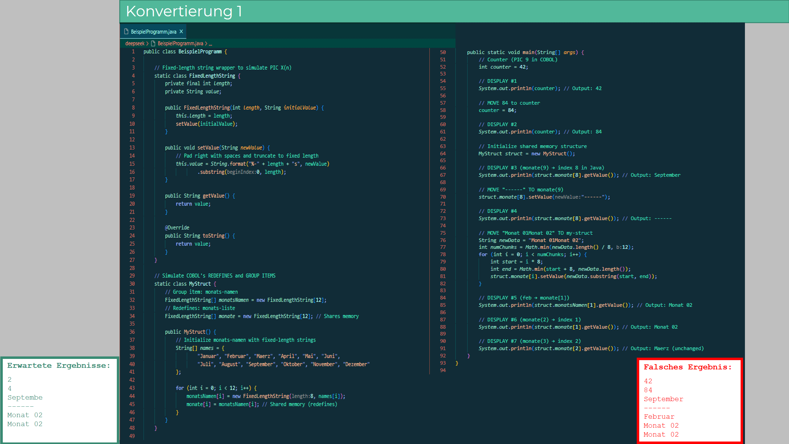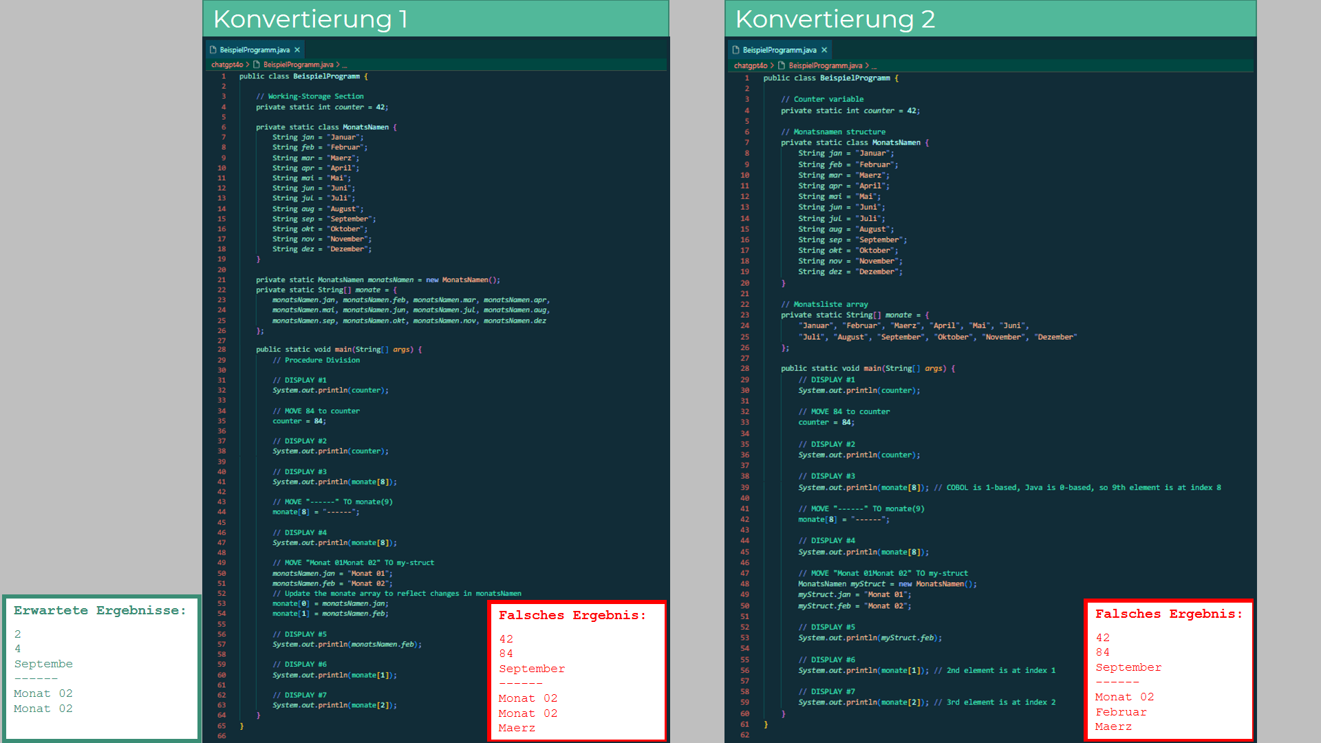 Für Konvertierung 1 wurde ein einfacher Prompt verwendet, der den Verweis auf die Beibehaltung COBOL-ähnlicher Funktionalitäten in Java einschloss. Aber auch hier zeigte sich: