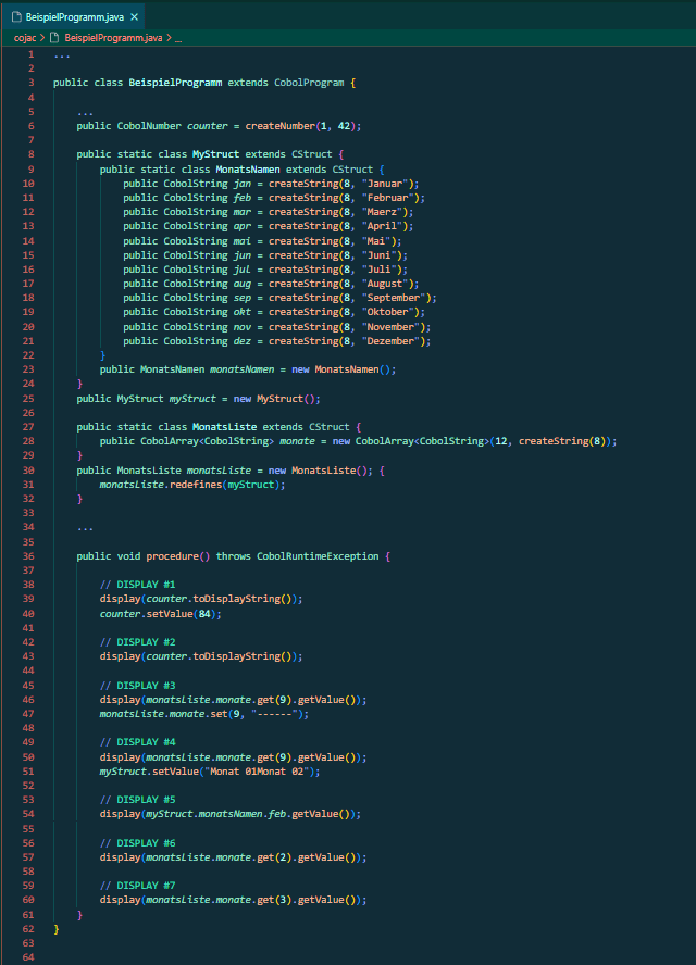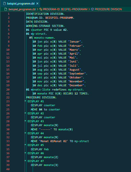 Die Testbasis bildet ein einfaches COBOL-Programm. Das Programm besitzt keine Logik. Es beinhaltet jedoch COBOL-typische Anweisungen, welche im produktiven Umfeld zahlreich Anwendung finden. Das COBOL-Programm erschließt sich versierten COBOL-Programmierern unmittelbar. Es werden unterschiedliche Datendefinitionen mit gleichzeitiger Initialisierung vorgenommen. Die Daten werden manipuliert, z.B. durch Wertzuweisungen bzw. Überlagerungen, und nach jeder Manipulation mit DISPLAY angezeigt.