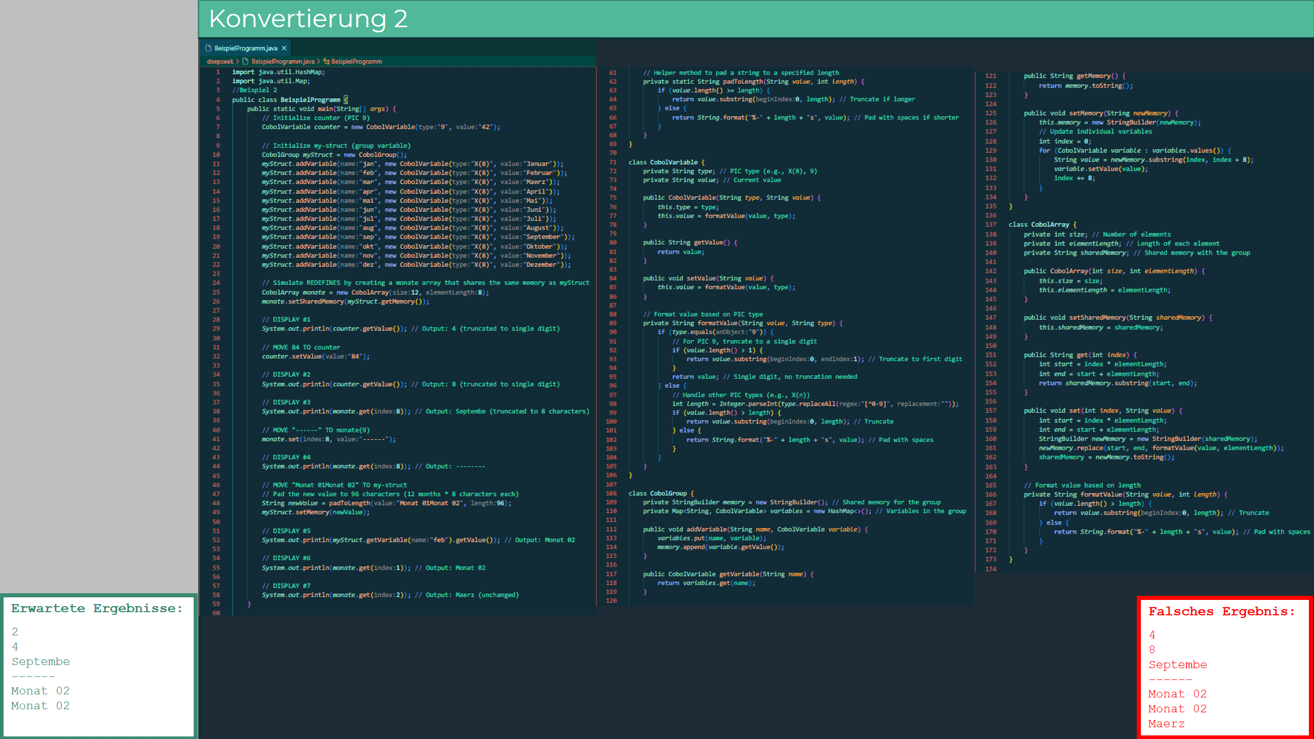 Das Java-Programm wurde kompiliert und ausgeführt. Zur Laufzeit lieferte das Java-Programm identisch zum COBOL-Programm die korrekten Ergebnisse.