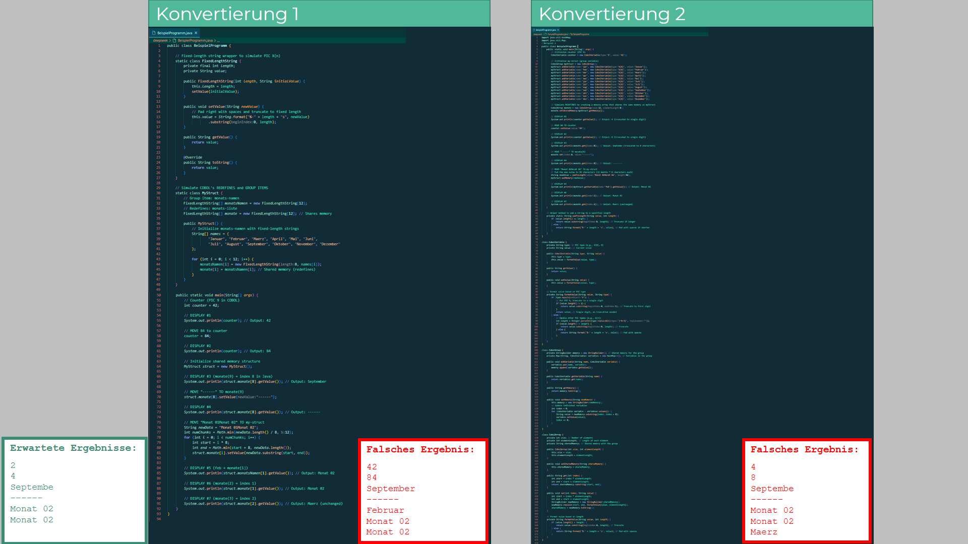 Aus dem COBOL-Programm wurden von allen KI-Tools Java-Programme erzeugt, welche eine identische Funktionalität besitzen sollten. Es muss angemerkt werden, dass die verschiedenen KI-Tools nicht für die gestellte Aufgabe speziell trainiert wurden.